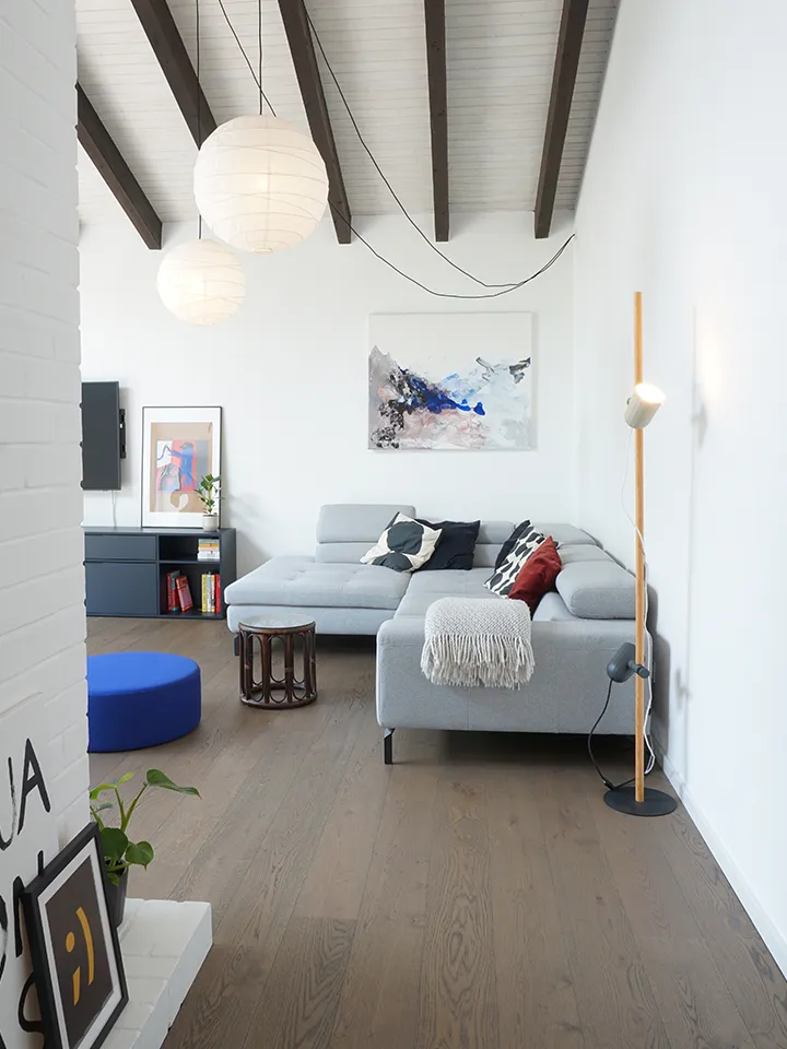 Eine besondere Herausforderung stellte die geringe Geschosshöhe des Bestands dar. Durch das Öffnen des Wohnraums nach oben wirkt der Raum heute deutlich höher und weniger gedrungen. Gleichzeitig sorgt die neue Raumstruktur dafür, dass alle Bereiche vom Tageslicht profitieren. Küche, Ess- und Wohnbereich sind von morgens bis abends lichtdurchflutet, das Licht bewegt sich durch den Raum und verbindet die Zonen miteinander. So entsteht ein zusammenhängendes Wohngefühl, das Offenheit nicht nur sichtbar, sondern spürbar macht.