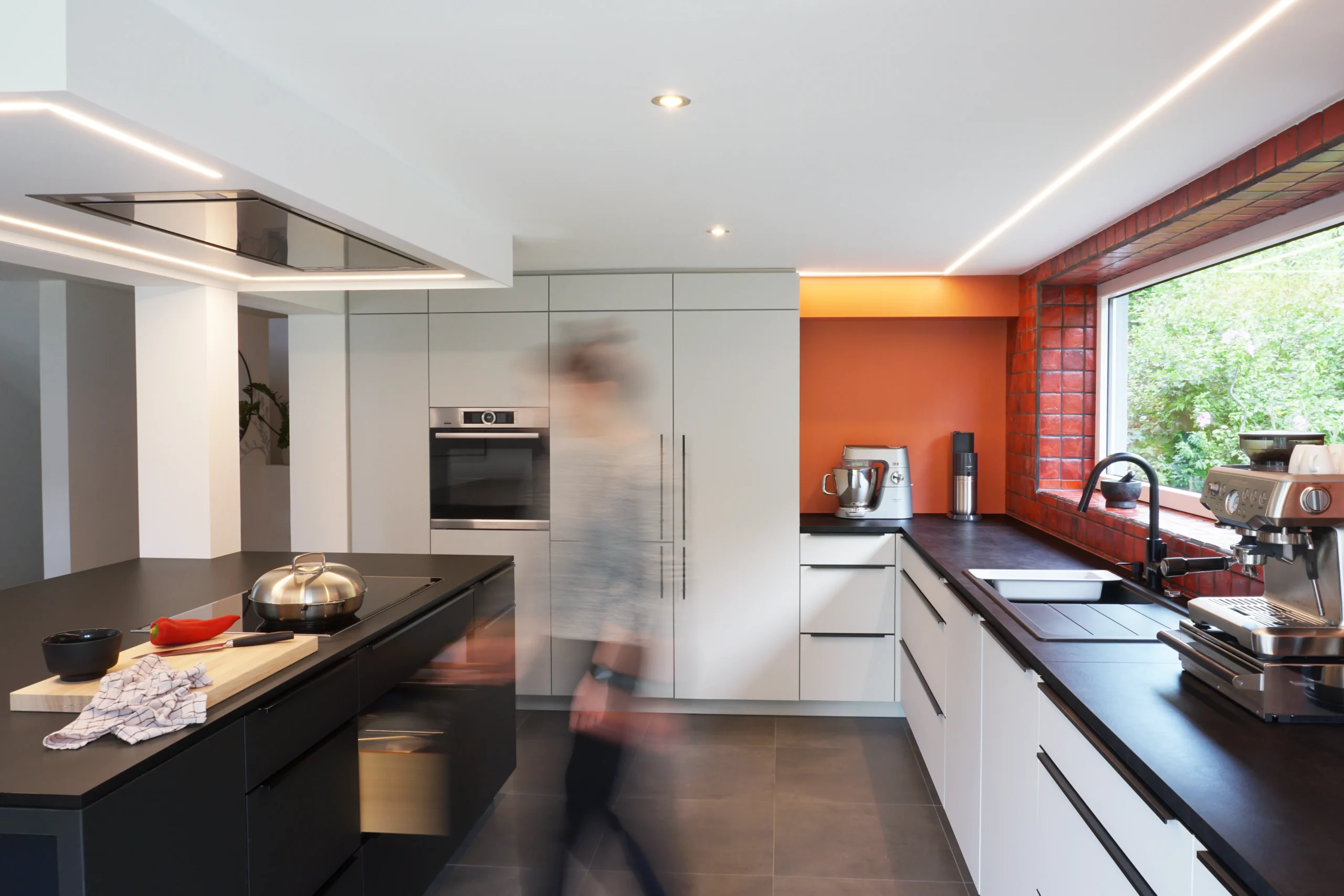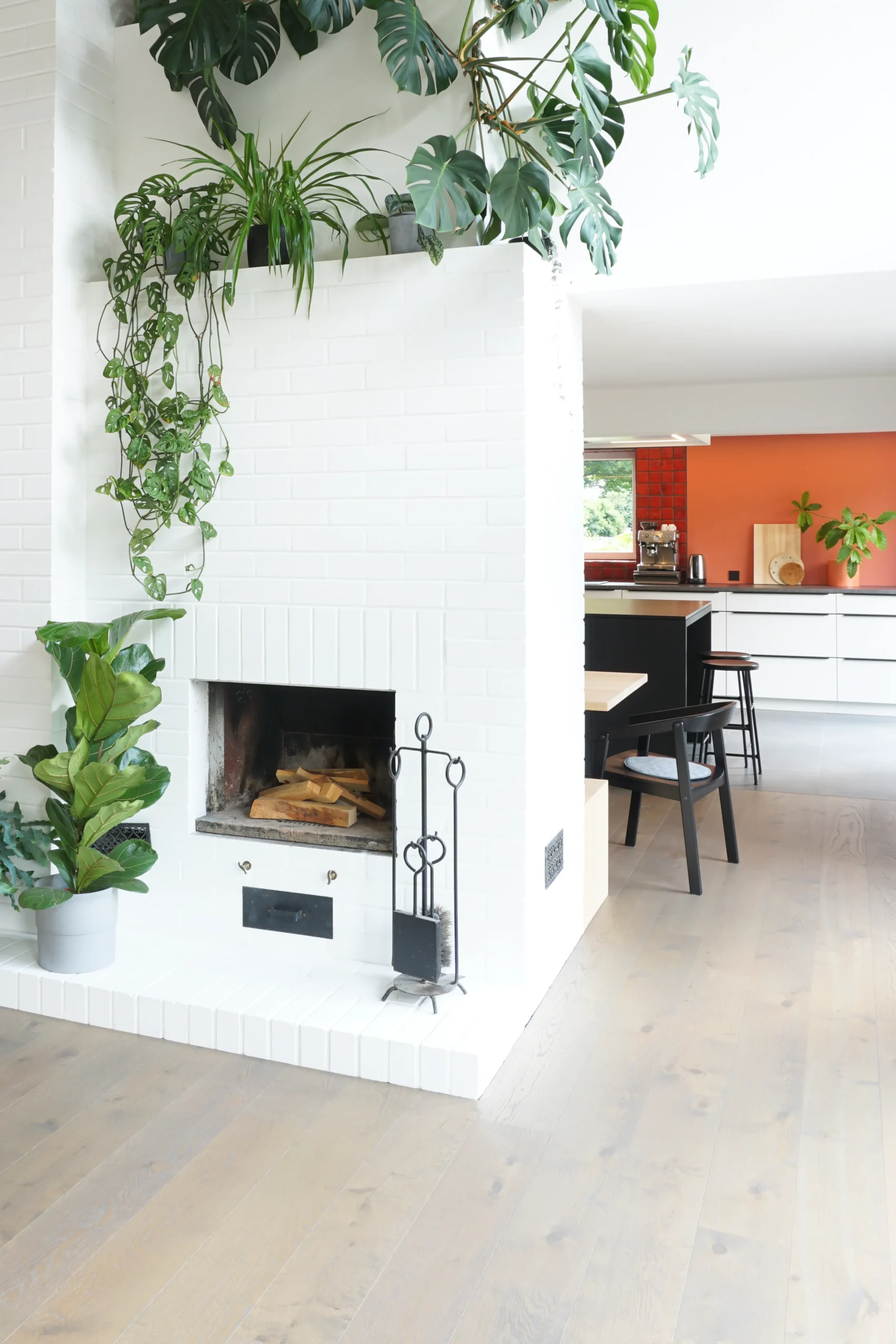 Zwei räumliche Kerne gliedern den offenen Grundriss und definieren die Abfolge von Kochen, Essen und Wohnen. Die Küche wurde vergrößert und geöffnet und ist heute nur noch über eine Kücheninsel vom Essbereich getrennt. Dadurch entsteht ein großzügiger Blick in den Wohnraum, während der Wohnbereich selbst durch einen Kaminblock räumlich gefasst bleibt.